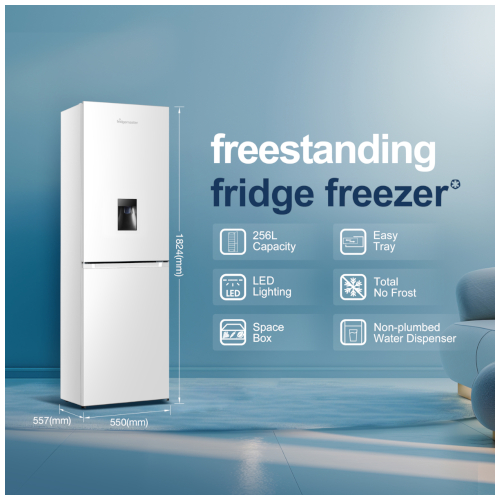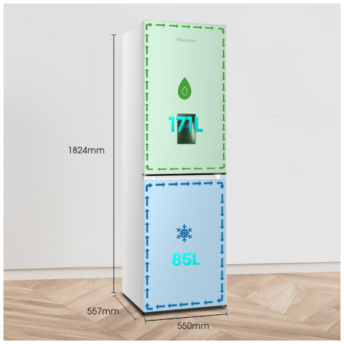 Keep it cool and classy with the Fridgemaster MC55251 series. Wrapped in classic white this fridge freezer brings a breath of fresh air into any kitchen. With 256 litres of total storage, including a 171-litre fridge and an 85-litre freezer, it’s tailored for those who love a mix of frozen delights and fresh bites. The water dispenser provides pre-chilled refreshment on tap, whilst the whisper-quiet 37 dB noise level makes less noise than a secret. Plus, the auto-defrost feature means you can say goodbye to manual scraping, more time for chilling!