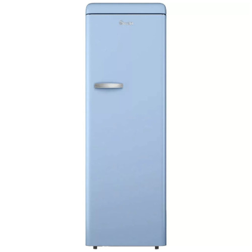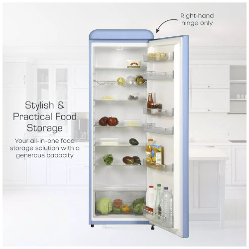 The Swan Retro Tall Larder Fridge combines style and practicality with a large 337-litre total capacity, making it perfect for a busy family home. It includes 5 glass fridge shelves, 1 chrome wine rack, 6 door shelves and 1 salad crisper for organised storage. There’s an adjustable temperature control for varied chilling levels, keeping salads crunchy and beverages refreshing for longer. This retro fridge is also highly economical to run thanks to the E energy rating, making it environmentally friendly and cost-saving without compromising on performance. It also makes a thoughtful and practical gift for newlyweds or people celebrating a new home. The Swan Retro Tall Fridge is a statement piece that does more than just preserve your food; it enhances your kitchen’s aesthetic appeal. Its exquisite soft blue exterior, with smoothly rounded corners and a polished metal handle, introduces a splash of retro elegance that complements any décor.
